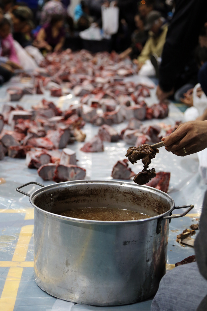 Tout d’abord, à l’aide de votre ulu, découpez en cube la pièce de viande. Au passage, mangez quelques morceaux crus question de tester la marchandise. Réservez une partie du gras (celle qui se défait en filaments) pour plus tard.